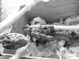 昨天,王女士提供了兩組圖片。一組是廈門(mén)寄件時(shí)的圖片,圖片顯示當(dāng)時(shí)玉龍雕被包裹得嚴(yán)嚴(yán)實(shí)實(shí)的。一組是加拿大客戶(hù)收件時(shí)的圖片,圖片顯示碩大的木箱里裝滿(mǎn)了泡沫、紙張等填充物,但玉龍雕卻掉了一條腿。