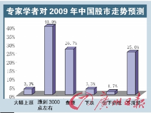 對(duì)于今年中國股市的走勢(shì),40%的專家認(rèn)為將恢復(fù)上漲到3000點(diǎn)左右,26.7%的受訪專家認(rèn)為市場(chǎng)處于盤整期,認(rèn)為“大幅上漲”和“下跌”的各占3.3%,另有25%的人表示“不清楚”。(詳見上圖) (文/記者黃蓉芳 通訊員徐剛、史玉梅)