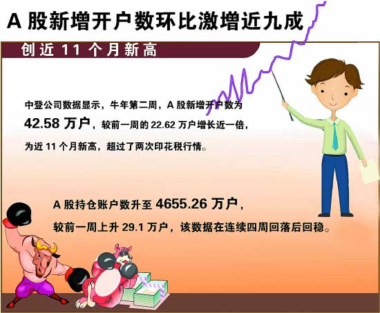 自2008年10月以來(lái)的這波反彈行情,形成了較大的財(cái)富效應(yīng),由于指數(shù)權(quán)重股的滯漲,上證指數(shù)至今僅累計(jì)上漲40%左右,但相當(dāng)多個(gè)股已經(jīng)翻倍。在市場(chǎng)賺錢(qián)效應(yīng)吸引下,股民入市熱情被激發(fā),中登公司最新公布的數(shù)據(jù)顯示,牛年第二周,A股新增開(kāi)戶(hù)數(shù)為42.58萬(wàn)戶(hù),較前一周的22.62萬(wàn)戶(hù)增長(zhǎng)近一倍,為近11個(gè)月新高,超過(guò)了兩次印花稅行情。