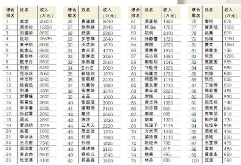 本次榜單前三名均來自港臺(tái)地區(qū),56歲的功夫巨星成龍登上榜首,去年5月他成為在“鳥巢”舉辦個(gè)唱的第一人,150多名明星嘉賓輪番登臺(tái),觀眾超過7.5萬人。周杰倫位居第二,沒有新唱片并不影響商家和粉絲的追捧,他努力嘗試新的影視作品,有得有失。排在第三位的劉德華出演了3部電影,由于婚事曝光備受關(guān)注。今年雖共有43位明星來自港臺(tái),但其成就卻都仰仗于大陸市場(chǎng)。在他們眼中,兩岸三地之間的界限越來越模糊。小巨人姚明仍穩(wěn)居大陸第一名。章子怡緊隨其后,雖然飽受爭(zhēng)議仍獲得25個(gè)封面報(bào)道。