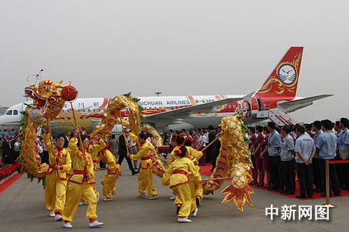 中新網(wǎng)成都6月23日電(楊杰 陳典路)23日下午17點09分,國內(nèi)總裝的第一架空客A320飛機、“中華龍”號調(diào)機航班抵達成都雙流機場,飛機緩緩滑向停機位,兩輛噴水車為飛機“噴水洗塵”;機坪上鑼鼓聲聲,獅舞龍騰。至此,國內(nèi)總裝的第一架空客A320飛機正式落戶四川航空。
