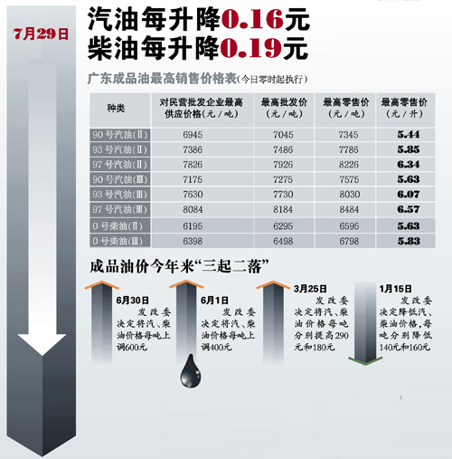 隨后,省物價局根據國家規(guī)定,也制定公布了廣東省的成品油銷售價格。這也是全省成品油價格繼6月份一個月內連續(xù)2次上漲之后,首次出現下調。降價的幅度從0.16元/升~0.20元/升不等,其中國Ⅲ標準97號汽油降價最多,降價后每升最高零售價為6.57元。