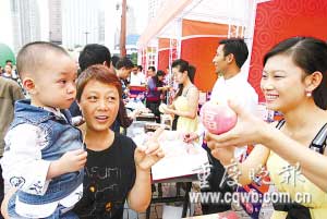 昨天的朝天門廣場,微風(fēng)伴著細(xì)雨,氣溫適宜,不少市民前來玩耍。廣場中央,是一個(gè)用蘋果搭成的展覽塔,廣場一側(cè),是昭通市政府的蘋果展銷臺,堆積如山的蘋果吸引了廣大重慶市民,負(fù)責(zé)推銷的工作人員不停地給蘋果削皮,削好的蘋果很快就被市民吃了個(gè)精光。