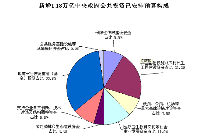 截至目前,1.18萬億元新增中央政府公共投資已安排資金5915億元,分項目情況如下:用于保障性住房建設(shè)資金522億元,占8.8%;農(nóng)業(yè)基礎(chǔ)設(shè)施及農(nóng)村民生工程建設(shè)資金1253億元,占21.2%;鐵路、公路、機(jī)場等重大基礎(chǔ)設(shè)施建設(shè)資金460億元,占7.8%;醫(yī)療衛(wèi)生教育文化等社會事業(yè)發(fā)展資金703億元,占11.9%;節(jié)能減排和生態(tài)建設(shè)資金260億元,占4.4%;支持企業(yè)自主創(chuàng)新、技術(shù)改造及結(jié)構(gòu)調(diào)整資金585億元,占9.9%;地震災(zāi)后恢復(fù)重建(基金)投資2000億元,占33.8%;公共服務(wù)基礎(chǔ)設(shè)施等其他項目資金132億元,占2.2%。