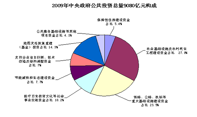此外,2009年中央政府公共投資預(yù)算總量為9080億元,比上年增加4875億元,分項目安排情況如下:用于保障性住房建設(shè)資金493億元,占5.4%;農(nóng)業(yè)基礎(chǔ)設(shè)施及農(nóng)村民生工程建設(shè)資金2522億元,占27.8%;鐵路、公路、機(jī)場等重大基礎(chǔ)設(shè)施建設(shè)資金2134億元,占23.5%;醫(yī)療衛(wèi)生教育文化等社會事業(yè)發(fā)展資金926億元,占10.2%;節(jié)能減排和生態(tài)建設(shè)資金696億元,占7.7%;支持企業(yè)自主創(chuàng)新、技術(shù)改造及結(jié)構(gòu)調(diào)整資金633億元,占7.0%;地震災(zāi)后恢復(fù)重建(基金)投資1300億元,占14.3%;公共服務(wù)基礎(chǔ)設(shè)施等其他項目資金376億元,占4.1%。