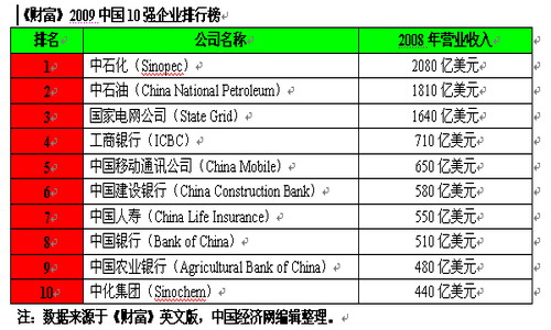 美國《財(cái)富》雜志英文版10月13日公布了中國10強(qiáng)公司排行榜,中石化以2080億美元銷售收入(2008年數(shù)據(jù))名列第一位,中石油排名第二,2008年銷售收入為1810億美元。排在第三位的是國家電網(wǎng)公司,2008年?duì)I業(yè)收入為1640億美元。