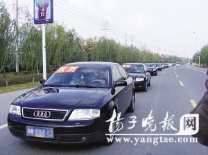 記者在現(xiàn)場看到,這支由28輛名車組成的豪華車隊,包括3輛寶馬、11輛奧迪、6輛豐田,以及別克、本田、帕薩特等高檔轎車。約9時10分左右,這支豪華車隊開始緩緩開動起來,最前面由一輛別克轎車“開道”,緊跟在后面的是一輛奔馳面包,車中坐著的就是當日車隊接送的“主角”——張良憲花費160萬元從外地買來的藏獒。這輛奔馳面包車前扎著大紅的綢花,車的側面掛著一條紅色條幅“中國名獒160萬元落戶宿遷張良憲藏獒繁育基地”。后面的車綿延跟進,每輛車都打著雙跳,緩緩前進,速度在20碼左右。