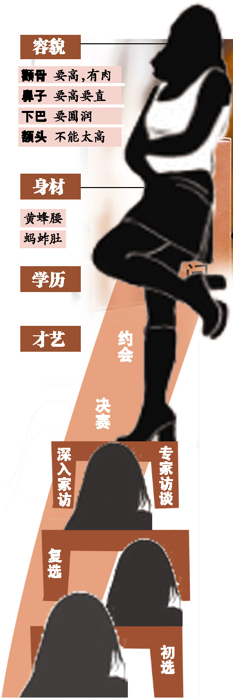 除了形象和心理測試,美女們還得過“面相關(guān)”。記者在現(xiàn)場看到,美女們經(jīng)過一關(guān)又一關(guān)甄選后,會來到“面相顧問”的房間,接受“來自香港的相學專家”的評判。“顴骨要高,有肉;鼻子要高要直;下巴要圓潤;額頭不能太高。旺夫相大體就這個標準!边@位“相學專家”表示,如果各方面條件都優(yōu)秀,但面相不符合要求,也會被淘汰出局。