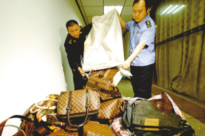 “都有些什么東西?”“隨便看嘛,皮包、皮帶,全是名牌喲……”1日晚7點多,設(shè)在渝中區(qū)某高檔寫字樓的一“專賣店”迎來了兩名特殊客人!皩Yu店”門口擺著近3平方米的大招牌,寫著“LV重慶店”等內(nèi)容。兩名客人進店后不到一分鐘,突然涌進10余名身著工商制服的執(zhí)法人員。