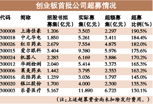 28家已發(fā)行的創(chuàng)業(yè)板公司全部存在超額募集資金現(xiàn)象。28家公司擬募集資金數(shù)量為70.784億元,實(shí)際募集資金154.784億元,28家公司合計(jì)超募83.184億元,平均每家公司超募2.971億元,這一數(shù)額甚至超過了個(gè)別中小板公司的募集資金額。