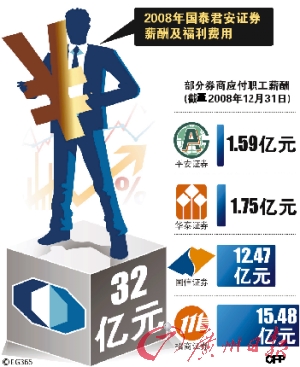 近日記者獲得了一份《2009年國泰君安證券總裁陳耿工作報告》,細讀中記者發(fā)現(xiàn),國泰君安證券2008年的薪酬及福利費用高達32億元,遠遠超出公司年初預(yù)算數(shù)的20.41億元。即使面對大熊市,國泰君安在滬深兩市的交易量也排在全國所有券商的前三甲。目前國泰君安員工數(shù)大約在3200人左右,按報告中32億元的總薪酬及福利費用計算,平均每個員工去年獲得的總收入就接近100萬元。
