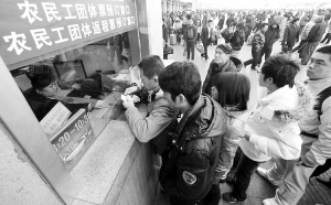 晨報訊(記者 張碩)昨天,北京站、北京西站開始銷售農民工火車票,并且接受農民工團體票的預訂。這次還開設了農民工返程團體票的預訂和發(fā)售,大大方便了在京農民工。據悉,1月6日至15日為民工流高峰。