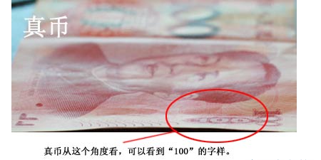 四測。市民可用紫光燈、驗鈔機等簡單工具檢驗鈔票真假,真幣鈔面“中國人民銀行”字樣下有一個金色的“100”,通過驗鈔機時機器不會發(fā)出聲響。假鈔在紫光燈照射下看不見這個“100”數(shù)字,用驗鈔機檢驗時,驗鈔機會發(fā)出滴滴的警報聲。