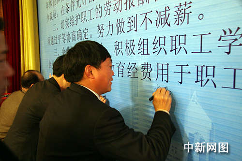 記者在現(xiàn)場(chǎng)看到,《共同約定書》中企業(yè)方的承諾主要是:企業(yè)依法采取縮短工時(shí),適時(shí)安排年休假和特別休假、輪崗輪休等形式保障職工崗位,做到不減薪、不裁員或少裁員。企業(yè)要組織職工學(xué)習(xí)新技術(shù),而且企業(yè)教育經(jīng)費(fèi)用于職工培訓(xùn)不少于70%。另一方面,職工方作出了立足本職、愛(ài)崗敬業(yè)、積極為企業(yè)發(fā)展獻(xiàn)計(jì)出力等承諾。