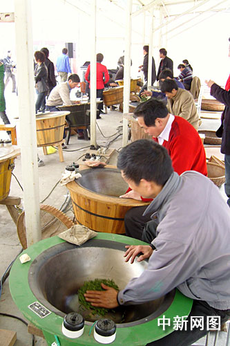 3月25日上午8時(shí),剛下過濛濛細(xì)雨的天空漸漸放晴,西湖區(qū)2009年西湖龍井“炒茶王”爭(zhēng)霸賽在龍塢茶葉交易中心順利舉行。說來也巧,在首輪抽簽環(huán)節(jié)中,兩位往年的“炒茶王”相繼抽到了1號(hào)和2號(hào),面對(duì)面地形成了“炒茶王”爭(zhēng)霸賽的第一個(gè)高潮——“雙王爭(zhēng)霸”的精彩場(chǎng)面。為公平比賽,此次所有參賽選手炒制的青葉原料都來自同一塊茶地。比賽中,每位選手都領(lǐng)到了2斤青葉,在經(jīng)過殺青、輝鍋、整理、二次輝鍋等工序后,以抽簽號(hào)裝袋后送由國(guó)家級(jí)一、二級(jí)評(píng)茶師和龍井茶葉產(chǎn)業(yè)協(xié)會(huì)秘書長(zhǎng)等評(píng)茶高手組成的評(píng)審團(tuán)評(píng)審。評(píng)審團(tuán)則通過觀、聞、品等方法,對(duì)各位選手炒制的茶葉外形、香氣、滋味、湯色、葉底等進(jìn)行打分,最后以綜合得分的高低產(chǎn)生“炒茶王”。