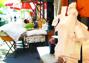 食品市場對面,幾家批發(fā)塑料制品的小鋪挨在一起。問及“限塑”之后生意有什么變化?店家的答案是:超薄的小袋兒沒有了,但其他袋子的出貨量并沒減少,生意跟以前差不多。