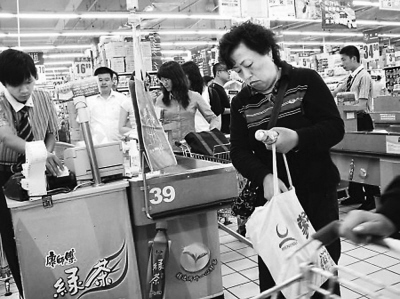 現(xiàn)在走進超市、商場,常常能看見“環(huán)保袋回家”等宣傳海報被張貼在顯眼的位置。許多顧客來買東西時,都提著超市出售的無紡布環(huán)保袋或自家的購物布袋。一部分沒帶包的顧客,則花上幾角錢,購買超市出售的符合規(guī)定的塑料袋。“顧客買塑料袋時大多盡量只買一個,不像以前會要好多個!背幸晃皇浙y員告訴記者,“現(xiàn)在塑料袋的重復(fù)利用率也很高,許多消費者都隨身帶著用過的舊塑料袋!辈簧俅笮蜕虉鲞用設(shè)計精美的紙袋代替了塑料袋,顧客在購買商品時,都主動詢問是否有紙袋。