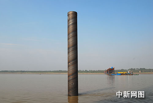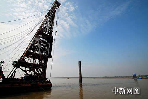 中新網(wǎng)九江10月15日電(胡國(guó)林)10月15日,施工人員在九江新長(zhǎng)江大橋所在的江面上用打樁船打下第一根鋼管樁,九江新長(zhǎng)江大橋第一根鋼管樁在江面成功豎立。
