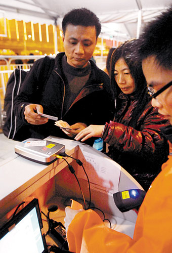 今天零時8分,廣州春運首趟實名制火車票列車———廣州至邵陽L7688次列車開出。昨日下午2時,春運異地候乘點琶洲展館迎來搭乘這趟列車的旅客。記者在現(xiàn)場看到,寬敞的展館里,實名制檢票窗口一字排開,乘客自覺準(zhǔn)備好身份證和火車票等待檢票。檢票人員用電子儀器掃過車票和身份證,信息一左一右顯示在電腦屏幕上,核對完畢需時僅10秒左右。實名制下首位順利通過檢票口的乘客是來自湖南邵陽的蔣先生!百I票時,我在售票窗口排了10分鐘左右,不是很麻煩,沒想到檢票更方便。”蔣先生面帶喜色地說。在檢票現(xiàn)場,公安部門還設(shè)置專窗,為沒帶或丟失身份證的旅客辦理臨時證明。