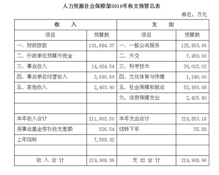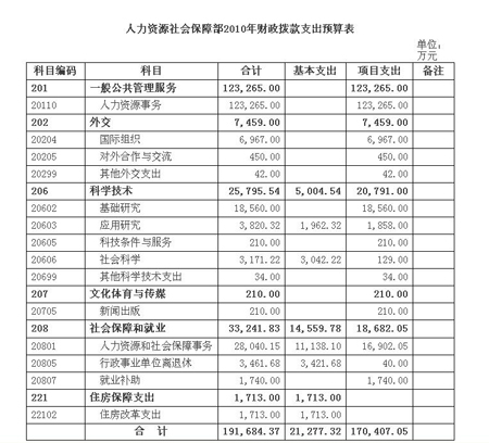 據(jù)人社部網(wǎng)站消息顯示,根據(jù)《財(cái)政部關(guān)于批復(fù)人力資源和社會保障部2010年部門預(yù)算的通知》(財(cái)預(yù)[2010]205號),人社部2010年預(yù)算情況如下: