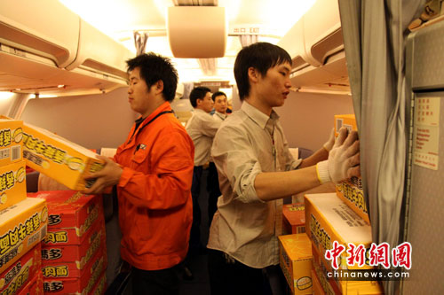 此次運(yùn)輸貨物的飛機(jī)是沒有旅客的客機(jī),因?yàn)槲鲗師o法降落大型貨機(jī),南航只能以 客機(jī)載貨。該批物資是廣東省府捐贈(zèng)給玉樹地震災(zāi)區(qū)的餅干、快食面等食品,共90357箱,總重量為38噸。因?yàn)轱w機(jī)容量有限,該批物資分兩批承運(yùn),當(dāng)晚首批裝載20.81噸。