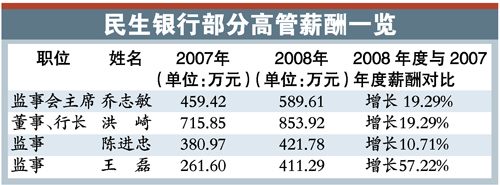 民生銀行的高管薪酬一直在銀行業(yè)中令人艷羨。2008年,民生銀行高管薪酬較2007年整體下降15%,其中,董事長(zhǎng)董文標(biāo)領(lǐng)薪1136.6萬元,比上年減少612.02萬元,下降35%;執(zhí)行董事、行長(zhǎng)王浵世下降10%至904.15萬元,副行長(zhǎng)邵平、梁玉堂等薪酬均下降至589.61萬元,其他高管也分別下降10%~15%。