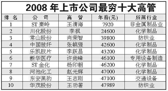 隨著2008年年報披露接近尾聲,上市公司高管薪酬孰高孰低再度成為市場關(guān)注的焦點。最近,一家財經(jīng)網(wǎng)站對已出年報的上市公司高管薪酬進行了統(tǒng)計,其中,ST秦嶺總經(jīng)理王清海以7920元的年薪成為榜單上的最窮總經(jīng)理。
