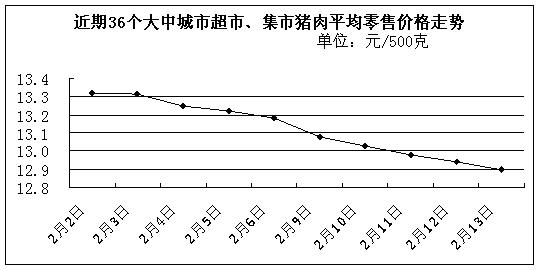 中新網(wǎng)2月16日電 據(jù)國家發(fā)展改革委價格監(jiān)測中心監(jiān)測,上周(2月9日-2月13日)36個大中城市超市、集市豬肉(精瘦肉)平均零售價格每500克為12.99元,比前一周(2月2日-2月6日,下同)下降2.04%。