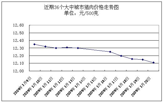 中新網3月23日電 據國家發(fā)展改革委價格監(jiān)測中心監(jiān)測,本周(2009.3.16-2009.3.20,下同)36個大中城市集市、超市豬肉(精瘦肉)平均零售價格每500克為12.17元,與前一周(2009.3.9-2009.3.13,下同)相比下降1.22%。