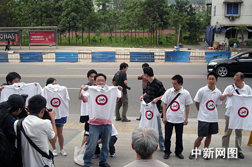 中新網(wǎng)重慶4月17日電 (銀雪 郭虹)17日,重慶市物價局舉行改革主城區(qū)公交票價聽證會,倍受當(dāng)?shù)厥忻耜P(guān)注。聽證會結(jié)束時,一群重慶市民在會場外身穿或手舉反公交漲價T恤,反對公交車票價上漲。