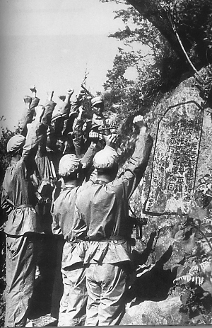 志愿軍戰(zhàn)士們?cè)邳S繼光烈士紀(jì)念碑前莊嚴(yán)宣誓。