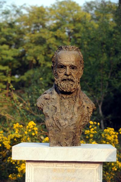 這是10月16日拍攝的雨果雕像。 10月16日,為紀念圓明園罹劫150周年,圓明園舉行雨果雕像揭幕儀式,青銅質(zhì)地的雨果半身雕像正式與游人見面。雕像高84厘米,寬50厘米,重90公斤,位于大水法遺址東側(cè),在底座上用中法文字鐫刻了說明詞,表達了“永久呼喚文明與和平的尊重,永久紀念人類的正義與良心”的愿望。在雕像南側(cè)書型石雕上鐫刻著雨果強烈譴責1860年英法聯(lián)軍洗劫圓明園暴行的《致巴特勒上尉的信》。雕像由法中友好聯(lián)合會、中國人民對外友好協(xié)會和法國東方華人協(xié)會共同捐贈,法國雕塑家娜什拉·凱努制作。新華社記者羅曉光攝