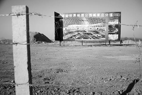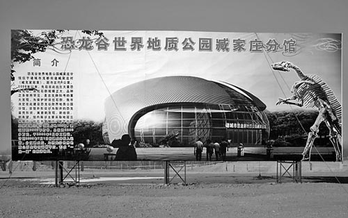 在諸城市政府網(wǎng)站上,關(guān)于最新的招商引資項(xiàng)目中,就有兩個(gè)關(guān)于建設(shè)恐龍化石地質(zhì)公園的項(xiàng)目。在臧家莊發(fā)掘現(xiàn)場(chǎng),一個(gè)蛋殼形狀的場(chǎng)館規(guī)劃圖屹立在發(fā)掘現(xiàn)場(chǎng)。工作人員介紹說(shuō),自2008年以來(lái),先后在此出土大量恐龍化石,該化石群規(guī)模之大、品種之多世界罕見(jiàn),是古生物科考的重大發(fā)現(xiàn)。為保護(hù)好該化石群,諸城市決定在此建設(shè)恐龍谷世界地質(zhì)公園分館。該館外形設(shè)計(jì)為裂開(kāi)的恐龍蛋殼形狀,寓意新發(fā)現(xiàn)、新收獲、新希望。館內(nèi)展示主要采取底層立體展示、化石平面展覽、 地下化石層隧道展示等,項(xiàng)目占地約100畝,建筑面積3500平方米,總投資2000多萬(wàn)元,于2008年9月開(kāi)工建設(shè),計(jì)劃2009年7月1日前建設(shè)并投入運(yùn)營(yíng)。分館建成后,與恐龍谷世界地質(zhì)公園主場(chǎng)館遙相呼應(yīng),形成“一龍一蛋” 的旅游格局!敖ǔ芍蟠蠹揖涂梢皂樦鎏莸降叵拢纯窗l(fā)掘現(xiàn)場(chǎng),看看恐龍化石,這些在不遠(yuǎn)的將來(lái)都會(huì)實(shí)現(xiàn)。”工作人員告訴記者。工作人員所說(shuō)的主場(chǎng)館,就是即將建立在這次發(fā)掘出最大鴨嘴龍化石的庫(kù)溝村村北。在這條東西走向的化石隆起帶上,將建成一座全新的恐龍化石地質(zhì)公園。“ 這里發(fā)掘的恐龍化石,顏色還真挺特別,紅色、褐色的特別多,可能與這里的土質(zhì)有關(guān)吧!周圍都是紅土。 而在臧家莊那邊,發(fā)掘的化石顏色大都是黑色或者白色!