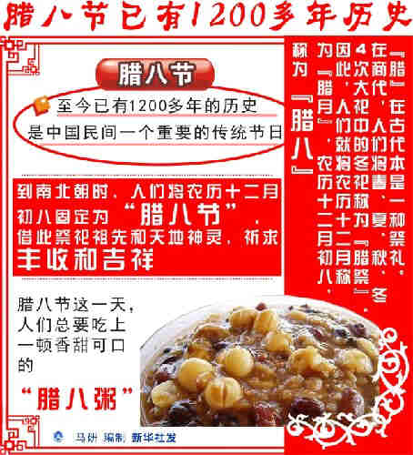 1月3日是農(nóng)歷十二月初八,是一年一度的臘八節(jié)。這一天在中國民間有吃臘八粥的習(xí)俗。有關(guān)專家指出,臘八節(jié)至今已有1200多年的歷史,是中國民間一個重要的傳統(tǒng)節(jié)日。