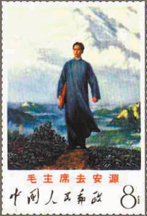 1968年8月1日,中國發(fā)行了一枚面值8分的郵票,是根據(jù)《毛主席去安源》的油畫設(shè)計的。圖中,毛澤東身穿藍(lán)布長衫,手拿雨傘,在烏云翻滾的天空下凝神走來,非常形象傳神。