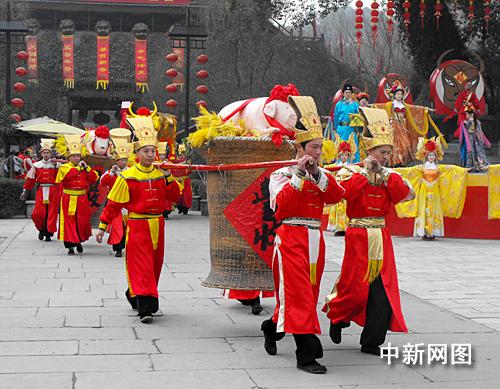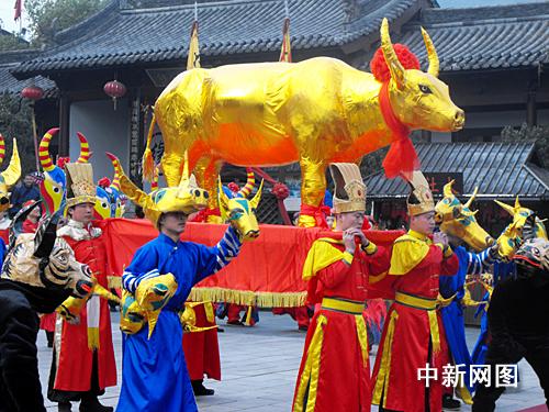 在杭州宋城景區(qū),記者看到,俏皮可愛(ài)的芒神手執(zhí)神鞭向一頭碩大的金牛揮去。每抽出一鞭,便引來(lái)圍攻群眾歡呼雷動(dòng)。身穿九龍絳紗袍的大宋皇帝手執(zhí)高香,引領(lǐng)文武百官、后宮嬪妃登壇祭拜,一步一停,口中念念有詞;繼而,臺(tái)下上百位演員裝扮各路神仙載歌載舞,鞭炮鼓樂(lè)響徹云霄……這便是2009年杭州宋城景區(qū)的主打民俗演出“鞭打春牛”的壯觀(guān)場(chǎng)景。