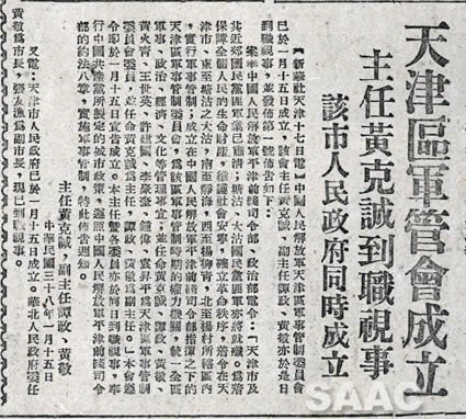 5. 1949年1月19日,《人民日?qǐng)?bào)》關(guān)于天津區(qū)軍管會(huì)成立的報(bào)道