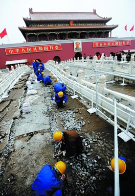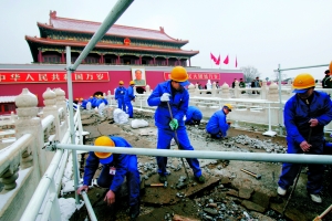 昨日下午2時,天安門前金水橋東西兩側的“品級橋”橋頭,已設2米多高的青灰色圍擋。東側的“品級橋”上,20多名佩帶天安門管委會施工工作證的工人,手持鐵錘和鑿子席地而坐,一點點“開墾”著橋面。據橋頭的安全員說,由于橋面空間較小,限制了進場施工人員數量,工人已分為兩班晝夜施工,保障工期。