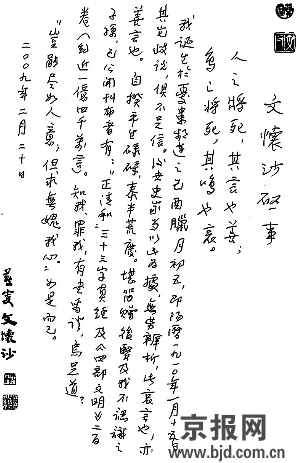 昨天(21日)傍晚,文懷沙家屬向本報(bào)提供了文懷沙啟事、文懷沙之子文斯以及友人趙缺先生的三篇文章,回應(yīng)李輝質(zhì)疑。本報(bào)來函照登,以饗讀者!幷