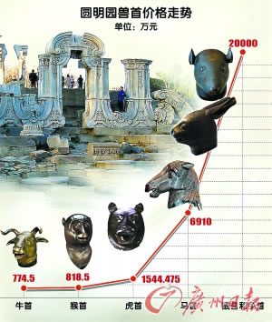 據(jù)悉,圓明園十二生肖獸首銅像流散海外近150年來,目前已經(jīng)有牛、虎、馬、猴、豬五首通過各種渠道回歸中國,鼠首和兔首銅像也已現(xiàn)身,剩余龍、蛇、羊、雞、狗五首至今下落不明。