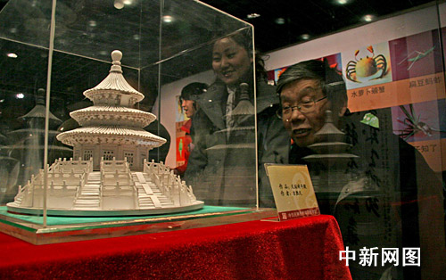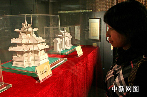 中新網(wǎng)二月二十八日電 (記者 甄雪原)“天壇祈年殿”、“故宮角樓”、“永安門城樓”、“岳陽樓”等一些中國著名建設(shè),今天再現(xiàn)于北京中華民族藝術(shù)珍品博物館內(nèi)。然后這些古代名樓的建筑材料不是磚瓦,而是普通的白卡紙。這是中華民族藝術(shù)珍品博物館今天開幕的一個“紙模珍品展覽”上的作品。其作者是北京市崇文區(qū)人大常委會主任吉勝久。