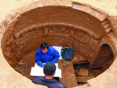 記者看到,在一個方坑內(nèi),有一座青磚壘砌的精美古墓已經(jīng)顯露出來。只見這個古墓有墓道、墓門和墓室。墓門呈拱形,高約1.6米,造型非常精致。墓室是圓形,頂部呈穹頂,高約2米,直徑約2米,北側(cè)有一盜洞痕跡。墓室底部由青磚鋪地,很像是一個炕。