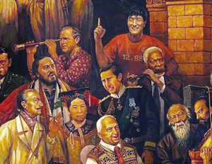 這幅畫可謂讓網(wǎng)友們開了眼,從來沒見過誰把如此眾多中外知名人物畫在一幅畫面中的,更何況還把這些名人們拼接得如此妙趣橫生、天衣無縫,大有天下大同之感?植婪肿永蔷驼驹诓际采砗,成吉思汗和拿破侖并駕齊驅(qū),搖滾明星崔健站在慷慨激昂的列寧身后,而他旁邊就是手拿書卷的希臘行吟詩人荷馬,而亞里士多德的手正扶在比爾·蓋茨的肩上,比爾·蓋茨身前是球王貝利,就在他的旁邊,手拿大刀的關(guān)云長和希特勒一起在聆聽貝多芬的琴聲,不遠處雷鋒叔叔帶著他熟悉的笑容望向畫面之外,而在畫面中央的圓桌旁,斯大林和達·芬奇則比鄰而坐,毛澤東和林肯促膝而談……簡直就是一幅世界名人的全家福。