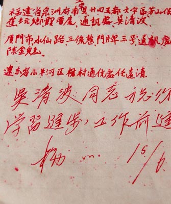 上海解放后,他們加入了解放軍。吳清波被分配到劉伯承、鄧小平領(lǐng)導(dǎo)的二野,陳金魁被分配到陳毅、粟裕領(lǐng)導(dǎo)的三野。分別時(shí)兩人約定,以后誰只要活著,一定要到對方家里看一看,當(dāng)時(shí)陳金魁用紅筆寫下了自家的地址:“廈門市水仙路三條巷門牌三號(hào)”。
