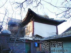 東西兩側(cè)的立面的二層也是各一六角弦窗,而一層由于雜房遮擋,已經(jīng)無法看見它的本來面部。早年岱王廟山門門楣之上懸掛有一塊漢白玉石刻的“岱王廟”匾額,廟內(nèi)正殿供奉著佛像,廟內(nèi)清幽肅穆,香火繚繞,梆槌聲聲。廟前山門左右兩旁各有一棵巨大的槐樹(今存一棵),一條東西大道在門前經(jīng)過。