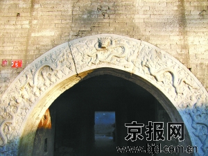 岱王廟坐落在盧溝橋西側(cè)的橋西街5號,坐北面南。遠(yuǎn)遠(yuǎn)望去,岱王廟建造的十分精巧,醒目。當(dāng)?shù)匕傩账追Q它為大王廟或大廟。岱王廟的山門和戲樓,平面呈T字形布局,銜接緊密,融為一體,是一座上下二層硬脊歇山頂磚木結(jié)構(gòu)的建筑。歷經(jīng)滄桑歲月,房脊兩頭的吻獸早已蹤跡皆無,只有東西山墻頂部的鈴鐺排山,保留的還算完整。整座建筑用青磚砌成,磨磚對縫,對仗工整,呈現(xiàn)了清時期的建筑風(fēng)格。山門的一層中央是石制拱形券門,券門兩旁是各一長方形豎窗。石制拱形券門刻有石雕,門首弧頂上方雕刻著探首的夔龍,在片片的祥云中翻轉(zhuǎn)騰挪,吞云吐霧。夔龍兩側(cè)各刻有兩條玩耍的蟠龍,像眾星捧月一樣游弋在探首的夔龍身邊。最為有意思的是,石制拱形券門兩側(cè)下部的石雕上,各刻有一只在水中山石間吐水的小獸,造型奇特,形態(tài)逼真,顯現(xiàn)出十分生動有趣的畫面,給整座石雕增添了一筆頑皮的色彩。整個券門上的石雕布局嚴(yán)謹(jǐn),古樸典雅,雕工灑脫,莊重中不失諧趣,顯示出那個時代工匠們的高超技藝。