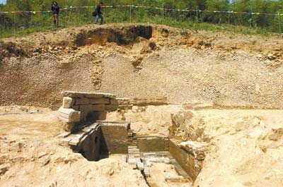汪大猷墓位于余姚市大隱鎮(zhèn)下磨村后山。記者昨天趕到現(xiàn)場,老遠看到一座山,幾乎半個面都被開掘出來,相當壯觀。沿著泥沙路往上走,路慢慢地變窄。不一會,前方出現(xiàn)一條亂石鋪成的道路。參與此次考古發(fā)掘的考古隊隊員羅鵬告訴記者,這是墓前的神道,以前神道兩旁各有對稱的石羊、石馬、石虎和石人4對石像生。不過年代久遠,其中幾座遭到損壞,現(xiàn)尚有4座保存在村民家中。記者眼前只見磚頭搭起的基座。