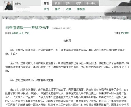而今,汶川地震周年紀念將至。2009年5月10日,余秋雨更新自己在新浪所開設(shè)的博客,文章主題即是地震。在這篇題為“向香港請假——答林汐先生”的博文中,余秋雨以答問的方式,談了自己對汶川地震的一些看法。