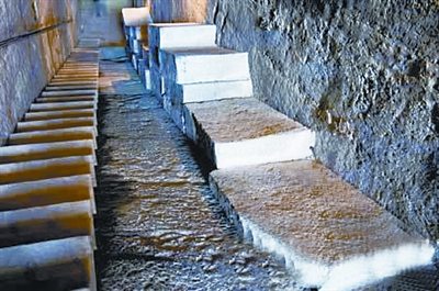與連環(huán)翻板功能類似的,是鐵索吊石。主要是在墓道頂和墻壁隱蔽處固定若干金屬滑輪,利用滑輪將巨石吊起,懸于頂端。墓道地下鋪木質(zhì)蹺板,索鏈由石板而下,通過滑輪以隱蔽的方式連接蹺板,中間有掛鉤和脫鉤相接,遇外力壓迫可自動(dòng)脫落。蹺板呈條狀,長(zhǎng)寬根據(jù)墓道具體情況而定。吊起之石可在墓道頂部懸掛三層,各層互不相依,索鏈通過石上孔洞收縮進(jìn)出。