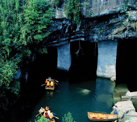 特別值得一提的是洞口處的通海橋,橋下一潭清澈見底的泉水嘩嘩作響,很可能存在活的水源。溯流而下,到了洞內(nèi)最低處,石壁清晰可見精雕細刻的花紋。雖然這里已經(jīng)位于新安江水面以下2米,上下落差有25米,但是洞內(nèi)通風狀況良好,并無任何不適感覺。另外,洞窟的怪異構造使得聲波被石壁吸收,無論多么大聲喧嘩,在洞內(nèi)都聽不到一絲回音。